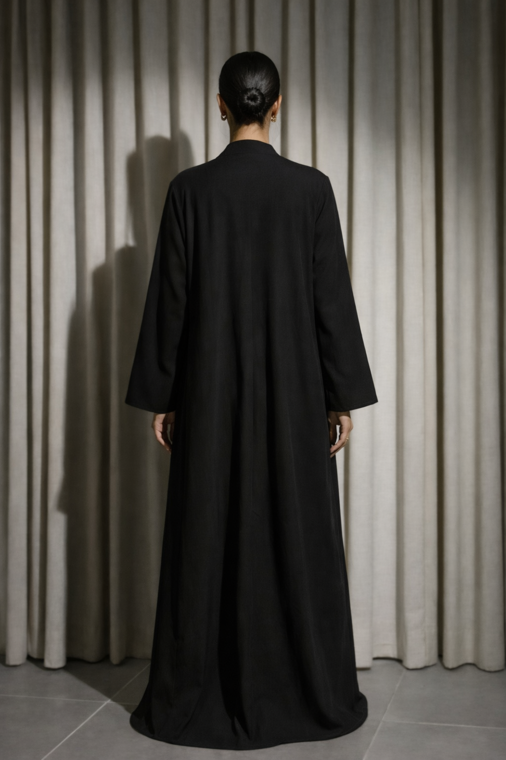 Cette abaya longue noire se distingue par son col asymétrique , apportant une touche moderne et originale à la silhouette. Ce détail subtil crée un jeu de lignes élégantes qui rendent la robe unique tout en conservant une allure sobre et chic.