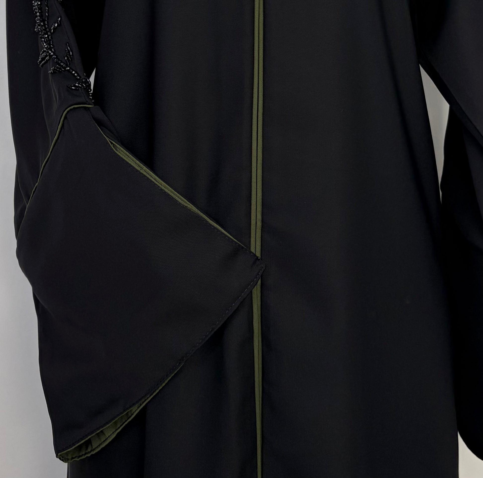 🖤 Abaya Noire Élégante à Manches Kaki – Perlage Raffiné Femme